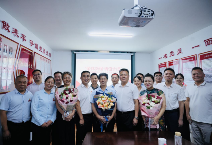 座谈会后,集团领导班子为3名退休员工献上鲜花并合影留念。